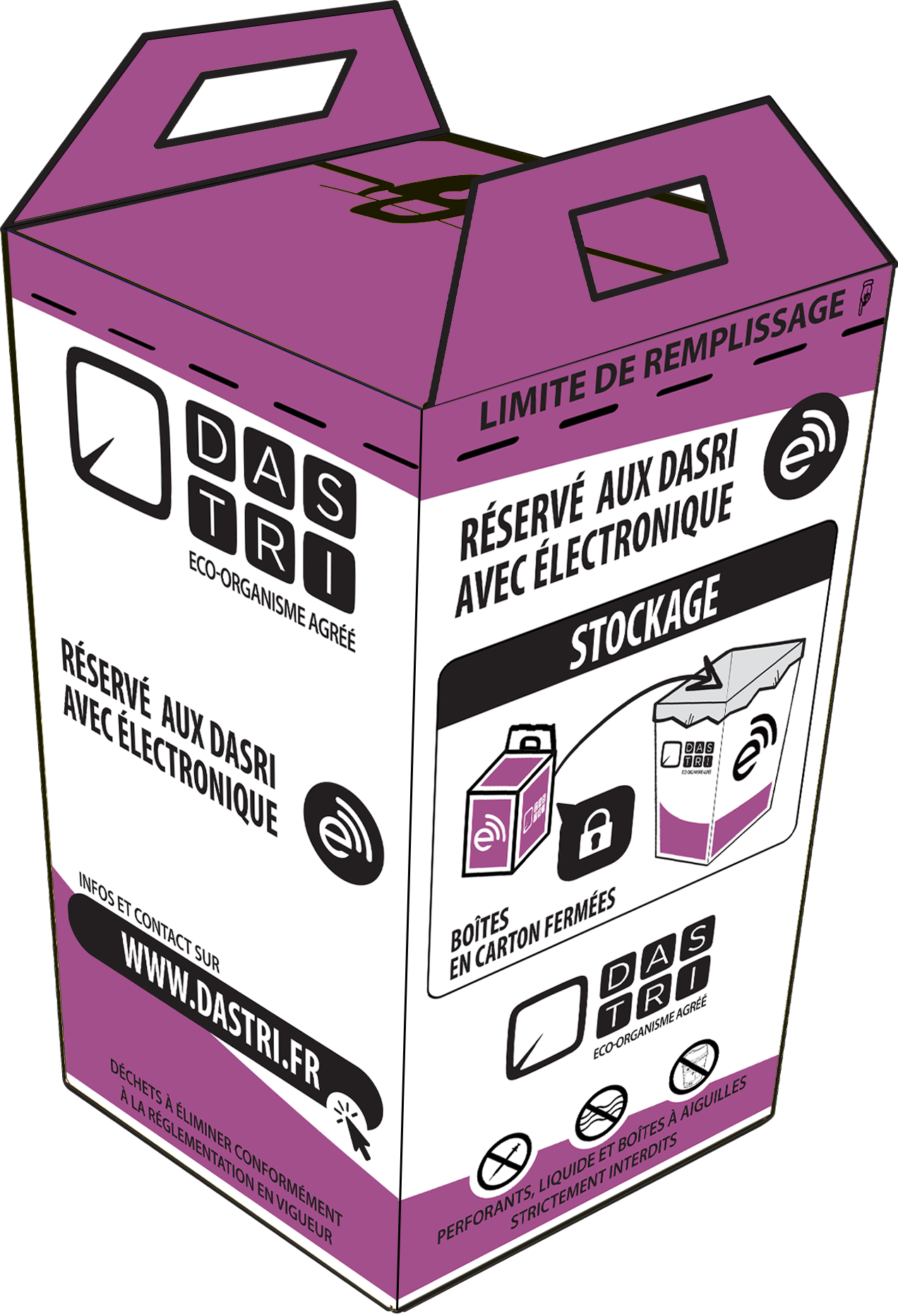 LA caisse carton violette est un sur-contenant de collecte qui doit être utilisé pour y déposer les boîtes violettes contenant les e-DASRI. Seules ces boîtes violettes peuvent y être déposées.